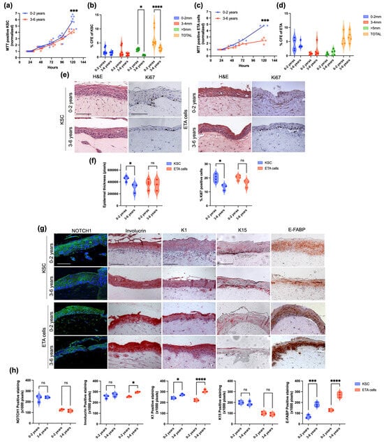 Similarly, skin equivalents both from infants and young children ETA cells showed a morphologically normal epidermis with a well-organized and polarized basal layer and differentiated suprabasal layers (Figure 2e). No significant difference in epidermal thickness and Ki67 expression was observed in skin equivalents from infants’ and young children’s cells (Figure 2e,f). On the other hand, differentiation tends to increase with age in skin equivalents generated from ETA cells. In particular, Involucrin, K1 and E-FABP expression was significantly more pronounced in young children than in infants. As expected, Notch-1 and K15 expression was lower in ETA cells than in KSC generated skin equivalents, but with no difference between the two age groups (Figure 2g,h).