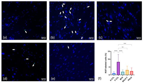 To evaluate the antiproliferative effect of balsacone C and phloretin on cocultures of T cells and psoriatic keratinocytes, immunofluorescence staining was performed for Ki67, a proliferation marker (Figure 2). As expected, the expression of Ki67 was statistically higher for the psoriatic control (psoriatic keratinocyte and T cell cocultures, Figure 2b) compared with the healthy control (healthy keratinocyte monocultures, Figure 2a). Our results show that the expression of Ki67 was significantly decreased in psoriatic keratinocyte and T cell cocultures treated with methotrexate (Figure 2c), balsacone C (Figure 2d), and phloretin (Figure 2e) compared with the psoriatic control. This analysis demonstrates that the polyphenols reduce cell proliferation in a 2D psoriatic model.