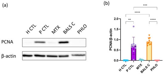 Proliferating cell nuclear antigen (PCNA) expression in the healthy control, corresponding to healthy keratinocyte monocultures (H CTL), psoriatic control, corresponding to a T cell and lesional psoriatic keratinocyte coculture (P CTL), and psoriatic cocultures treated with methotrexate (MTX), balsacone C (BALS C), and phloretin (PHLO). (a) For each condition, 10 μg of total protein from the cultures was analyzed by Western blot for the expression of PCNA. β-Actin was used to control equal loading. The analyses were carried out on samples from three different populations of healthy keratinocytes for the healthy control (N = 3) and from three populations of psoriatic keratinocytes for all the psoriatic conditions (N = 3). For each condition, the samples were from three cocultures (n = 3). One representative immunoblot is shown per analyzed protein. (b) Densitometric analyses of the immunoblots from panel (a) are presented. Statistical significance was determined using a Kruskal-Wallis test followed by Dunn’s multiple comparisons test. ** p < 0.01; *** p < 0.001; **** p < 0.0001. For each condition, different colors and symbols for the data points are represented; blue squares for H CTL, purple circles for P CTL, followed by the treatments, green triangles for methotrexate, orange inverse triangles for balsacone C and red diamond shapes for phloretin.
