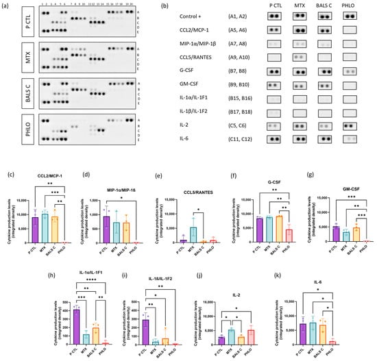 Psoriasis is an inflammatory skin disease with an increased production of multiple cytokines []. In this study, the secretion of 36 cytokines was evaluated using the dot blot protocol after the treatment of T cell and psoriatic keratinocyte cocultures (Figure 4a). The cytokines with significant differences between the psoriatic control and at least one of the evaluated treatments are presented with their duplicate spots (Figure 4b) and with their densitometric analyses (Figure 4c–k). One of the cytokines whose levels were the most altered after the treatments was monocyte chemoattractant protein-1 (MCP-1/CCL2). The level of this chemokine was significantly reduced after using phloretin as a treatment on the cocultures compared with the psoriatic control (Figure 4c). This inflammatory molecule is a chemokine produced by keratinocytes, which attracts monocytes and is found at higher levels in the blood of patients with psoriasis []. In addition, MCP-1 acts as a chemoattractant for T cells []. Phloretin participated in a reduction in MCP-1 production by keratinocytes, thereby reducing the attraction of T lymphocytes. In another study, MCP-1 levels were reduced after adipocytes were treated with phloretin in pro-inflammatory conditions []. Other inflammatory molecules that were reduced in quantity using phloretin are macrophage inflammatory protein-1α (MIP-1α) and MIP-1β (Figure 4d). In the literature, it was reported that they are present at higher levels in the blood of patients with psoriasis vulgaris compared with normal blood []. MIP-1α and MIP-1β can be secreted by multiple cell types, including macrophages, activated natural killer (NK) cells, and T lymphocytes []. MIP-1α levels have also been reduced by using phloretin on adipocytes in pro-inflammatory conditions []. CCL5/RANTES is another chemokine involved in the recruitment of T lymphocytes, eosinophils, and monocytes and is produced by keratinocytes as well []. RANTES is expressed more abundantly in lesional psoriatic skin than in non-lesional; however, it is not the principal actor in the pathology []. In the cytokine array analyses, there were no significant differences in its expression between the psoriatic control and the treatments, including the phenolic compounds and methotrexate. However, the secretion of RANTES was significantly increased with methotrexate compared with balsacone C; either balsacone C had little effect on the secretion of RANTES or methotrexate increased the production of RANTES (Figure 4e). A clinical study in patients with rheumatoid arthritis showed that a six-month administration of methotrexate could increase serum RANTES levels in 40% of the patients [].