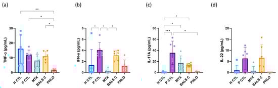 Levels of inflammatory cytokines in the supernatant of healthy keratinocyte monocultures (H CTL) as well as T cell and psoriatic keratinocyte cocultures (P CTL, MTX, BALS C, and PHLO). ELISA analyses were used to detect different secreted cytokines in culture supernatants collected after 7 days of treatment. The impact of the different treatments on keratinocyte and T cell production of (a) tumor necrosis factor alpha (TNF-α), (b) interferon-gamma (IFN-γ), (c) interleukin-17A (IL-17A), and (d) interleukin-22 (IL-22) was measured using, respectively, the TNF-α Human ELISA Kit, the IFN-γ Human ELISA Kit, the IL-17A Human ELISA Kit and the IL-22 Human ELISA Kit from Invitrogen™ (ThermoFisher Scientific, Waltham, MA, USA). Data presented are for N = 3 donors of healthy keratinocytes or N = 3 donors of psoriatic keratinocytes. Each condition was evaluated using the supernatant of two cocultures (n = 2 per condition) in duplicate as per the recommendations of the protocol. Statistical significance was determined using a Kruskal-Wallis test followed by Dunn’s multiple comparisons test. * p < 0.05; ** p < 0.01; *** p < 0.001. For each condition, different colors and symbols for the data points are represented; blue squares for H CTL, purple circles for P CTL, followed by the treatments, green triangles for methotrexate, orange inverse triangles for balsacone C and red diamond shapes for phloretin.