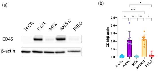 Lymphocyte common antigen (CD45) expression in healthy control, healthy keratinocyte monocultures (H CTL), and T cell and psoriatic keratinocyte cocultures; psoriatic control (P CTL) and cells treated with methotrexate (MTX), balsacone C (BALS C), and phloretin (PHLO). (a) For each condition, 10 μg of total protein from the cultures was analyzed by Western blot for the expression of CD45. β-Actin was used as a loading control. The analyses were carried out on samples from three different donors of healthy keratinocytes for the healthy control (N = 3) and from three donors of psoriatic keratinocytes for all the psoriatic conditions (N = 3). For each condition, the samples were from three cocultures (n = 3). One representative immunoblot is shown per analyzed protein. (b) Densitometric analyses of the immunoblot from panel (a). Statistical significance was determined using a Kruskal-Wallis test followed by Dunn’s multiple comparisons test. * p < 0.05; ** p < 0.01; *** p < 0.001. For each condition, different colors and symbols for the data points are represented; blue squares for H CTL, purple circles for P CTL, followed by the treatments, green triangles for methotrexate, orange inverse triangles for balsacone C and red diamond shapes for phloretin.