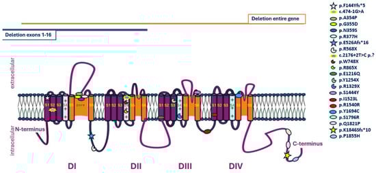 Voltage-gated Na+ channels share a common structure containing one α and one, or more, auxiliary β subunits. Amongst the nine well-characterized α subunit proteins, Nav1.1 is enriched in the central nervous system (CNS) and more specifically to the dendrites and cell bodies of excitatory neurons. Nav1.1 comprises four homologous domains (DI–DIV) each of which contains six α transmembrane helices (S1–S6) connected by loops. The S4 helix shapes the voltage sensors and the S5 and S6 helices, with their connecting loop, shape the ion-conducting pore [9]. SCN1A, the gene encoding for the Nav1.1 channel, has 26 exons, is located at 2q24.3 and exhibits dominant interneuron-specific expression. SCN1A pathogenic or likely pathogenic variants affect the initiation and propagation of action potentials and disrupt regular neuronal excitability, leading to various types of seizures [10]. Depending on the actual impact of each variant they can be specifically categorized as loss of function (LOF), partial loss of function (pLOF), decreased excitability (DE), gain of function (GOF), increased excitability (IE) and simultaneously gain–loss of function (G-LOF). Genotype–phenotype correlations have indicated that LOF variants affecting the pore region are mainly associated with SMEI although missense variants in the same region have been recorded in patients with generalized epilepsy febrile seizure + (GEFS+) [11,12]. Focal febrile seizures are usually linked to pLOF and G-LOF variants and GEFS+ to IE, DE, pLOF or GOF variants [12]. SCN1A variants are transmitted in an autosomal dominant pattern; however, incomplete penetrance and variable expressivity have been recorded, further adding to the great variability of phenotypes, the first of which is currently known as Dravet syndrome, previously SMEI, as described by the French neurologist Charlotte Dravet in 1978 [13]. Advances in the clinical description and genetic diagnosis of many patients has allowed the classification of a broad spectrum of SCN1A-related disorders, including DS, myoclonic-atonic epilepsy (MAE), epilepsy of infancy with migrating focal seizures (EIMFS), early-infantile developmental and epileptic encephalopathy (EIDEE), GEFS+ and partial epilepsy with febrile seizure plus (PEFS+), as well as non-epileptic disorders such as familial hemiplegic migraine (FHM), autism spectrum disorders (ASD) and arthrogryposis [14,15,16,17,18]. SCN1A-related disorders are somehow considered pharmaco-resistant, and the use of sodium channel blockers, such as phenytoin, carbamazepine, oxycarbazepine and lamotrigine, is contraindicated in patients with channel haploinsufficiency, where aggravation of seizures and consequent neurodevelopmental deficits have been observed [19]. Treatment with topiramate or valproic acid [20] or enhancement of GABA receptor activity via benzodiazepines or stiripentol present a better option which combined with a ketogenic diet seems to have better results particularly in respect to cognition [21].