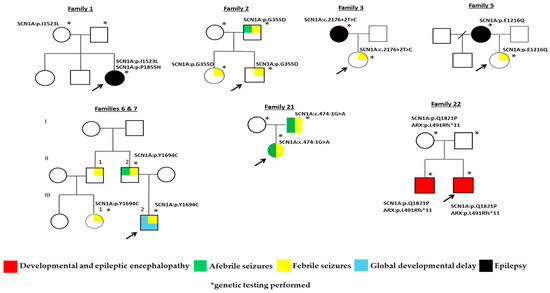 Genotype–phenotype correlation studies assess variants in the context of type, location and impact on the channel produced including functional distribution of missense variants and truncation effects on disease onset [27]. Those affecting the crucial voltage sensor S4, or pore S5–S6 domains or their intermediate loop typically lead to severe phenotypes with multiple types of pharmaco-resistant seizures and neurodevelopmental delay [12]. In Families 11, 12 and 23, probands presenting with global developmental delay, albeit of variable severity possibly explained by their different developmental stages, all have nonsense variants affecting the S4 subunit. Variants affecting subunits S5–S6 and their connection loop were detected in Families 2, 6/7, 9, 10, 14 and 25 where, except for cases 9 and 25, a positive history for various types of seizures was reported. However, segregation analysis, available in all but Family 14, indicated transmission of variants only in Families 2 and 6/7 (Figure 2). Phenotypic variability was noted in Families 6/7, where confounding mild global developmental delay and febrile status epilepticus were the reasons for referral in the proband (III-2, Figure 2). The offspring of a male patient had a diagnosis of grand mal epilepsy and seizures initially febrile and then afebrile until the age of 18 years old. His brother (II-1, Figure 2) also reports persistent but non frequent (1–2 episodes annually) febrile seizures treated with sodium valproate and, although refusing genetic testing, seems to have transmitted the familial pathogenic variant to his daughter (III-1, Figure 2), diagnosed immediately after her first episode due to the positive family history.