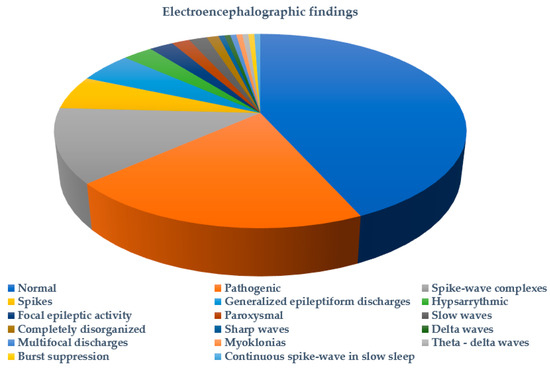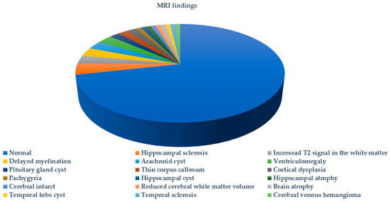Figure 3 summarizes the types of seizures or epileptic syndromes recorded. Electroencephalographic findings were available for 51.89% (178/343) of probands and imaging for 32.06% (110/343) (Figure 4 and Figure 5 respectively). Other clinical findings included: global developmental delay (82/343, 23.90%), speech delay (22/343, 6.41%), ASD (21/343, 6.12%), microcephaly (8/343, 2.33%), disorders of intellectual development (7/343, 2.04%), hypotonia (7/343, 2.04%), coarse facial features (6/343, 1.74%) and macrocephaly (2/343, 0.74%). Poor fine motor coordination, plagiocephaly, trigonocephaly, hydrocephalus, macroglossia, hypertonia, tremor, hemiplegia, ataxia, exostoses, cryptorchidism, hypogonadism, hyponatremia and enuresis nocturna were also reported in isolated cases.