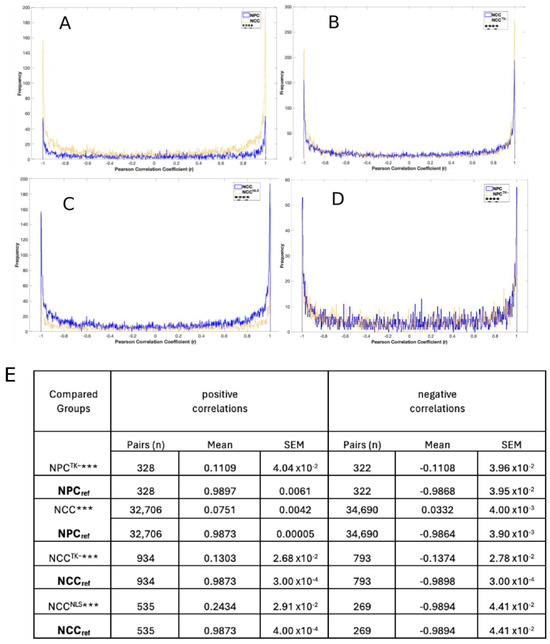 Correlation frequencies. Coordination of nervous system development (NSD) genes: frequency distributions of calculated Pearson coefficients (r). χ2 differences between compared conditions for entire range of correlations (−1 to +1): **** p < 0.0001); ns, nonsignificant. Gene coordination in NPCs and NCCs (A), NCCs and NCCTK−s (B), NCCs and NCCNLSs (C), and NPCs and NPCTK−s (D). From panels (A–D) we selected the NSD gene pairs which in the reference conditions had r > positive and r < negative critical r threshold values listed in Figure S3B. Table (E) compares the average Pearson coefficients (ravg) and the numbers of these strongly correlated gene pairs; *** p < 0.001 for both positive and negative correlations. Entropy changes associated with the correlation frequency distributions are listed in Table S1.