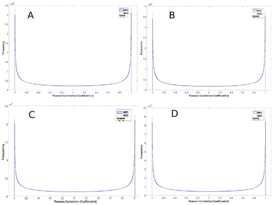 Further analyses showed that the distributions of correlations were significantly different between NPCs and NCCs such that the frequencies of strongly negative or positive correlations were higher for NCC genes. These differences were observed when examining all 16,137 expressed genes (Figure 3A) and when separately examining either the 4646 genes which changed their activities during NPC → NCC transition and were referred to as regulated (Reg) genes (Figure 3B) or the 11,491 genes that did not change their activities and were referred to as not regulated (nonReg) genes (Figure 3C). Furthermore, the cross-correlation of Reg and nonReg genes differed significantly between NPCs and NCCs (Figure 3D). These findings are summarized in Figure 3F.