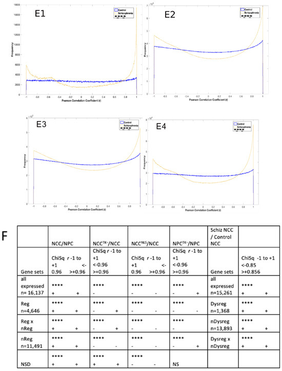 Distributions of gene correlations. χ2 tests were used for comparisons of conditions for the entire range (−1 to +1) of Pearson coefficients for NPCs vs. NCCs (A–D) and for NCCs from patients with schizophrenia versus those from control individuals (E). Comparisons of correlations for all expressed genes (16,137 genes) (A), for 4646 regulated (Reg) genes (average activity levels changed in NCCs compared to that in NPCs) (B), for 11,491 non-regulated (nonReg) genes (average activity levels did not change in NCCs compared to that in NPCs) (C), for cross-correlation of Reg and nonReg genes (D), 1386 genes commonly dysregulated in schizophrenia patients (Dysreg genes) (E1), all expressed genes in differentiating NCCs from patients and controls (15,279) (E2), 13,893 non-dysregulated (nonDysreg) genes (E3), cross-correlation of Dysreg with nonDysreg genes (E4). (F) Summary of the observed changes in r frequency histograms (based on Figure 2A–D, Figure 3A–E, and Figure S4–S6). **** (p < 0.0001; NS, not significant) refer to χ2 tests of −1 to + 1 range of correlations. (decreases and (+) increases mark direction of changes in strong positive or negative correlations. Entropy changes associated with the correlation frequency distributions are listed in Table S1.