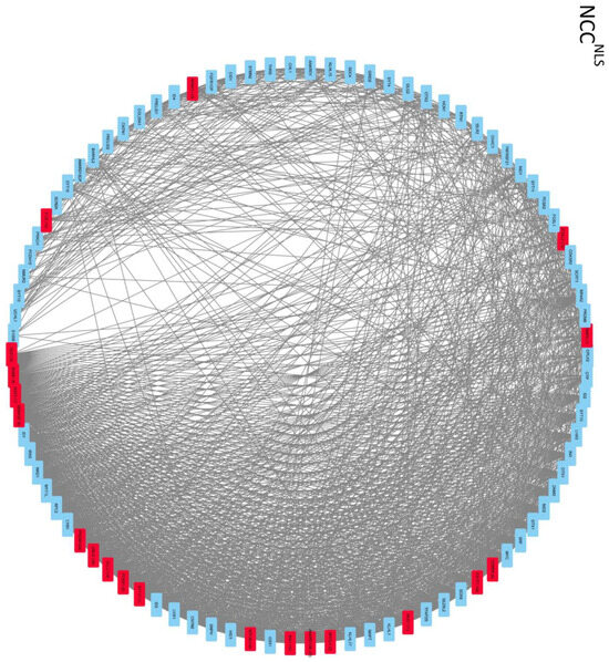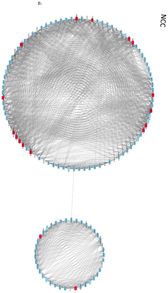 Cytoscape is an open-source platform designed to visualize complex networks and integrate them with various types of attribute data [29]. We used Cytoscape to calculate the complex network characteristics including the clustering coefficient, which is the degree to which nodes tend to cluster. The circular graph layout in Cytoscape aims to enhance the visualization of group and tree structures within a network. This layout algorithm employs a method of partitioning the network based on connectivity data, organizing these partitions into distinct circles. In Cytoscape, we assessed the connectivity structure of the network—nodes and their links (edges)—to form clusters that are then visually separated into circles. This clustering is typically based on connectivity metrics, such as node degree or betweenness centrality, which determine how nodes are grouped together. The hierarchical layout is designed to depict the main direction or flow within a network, which is useful for illustrating data with inherent directional or hierarchical relationships (e.g., gene regulatory networks). Nodes are placed on different layers, with the goal of minimizing the number of crossings between edges that connect these nodes. This involves sorting nodes within each layer in a way that aligns outgoing edges downward to the next layer with minimal crossing which includes layer assignment, crossing reduction, and coordinate assignment steps.