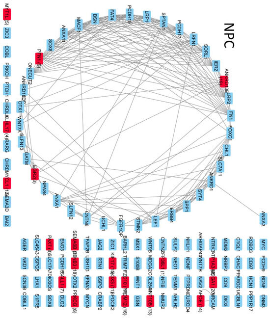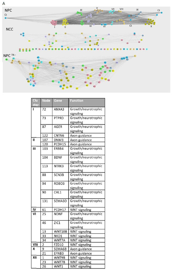 To investigate the biological consequence of gene coordination in the identified NSD GANs, we first performed unsupervised hierarchical clustering to highlight the relationships among specific genes. The gene functions (listed in Table S3A–C) were assigned based on the analyses using g:Profiler sapiens and Reactome and are listed in Table S3A–C. Figure 5A (top) shows that the 83 genes (listed in Table S3A) of the NPC GAN (see Figure 4A) formed ten color-coded clusters, with five non-clustered connector (Ct) genes; genes in this GAN are involved with mitochondrion-related apoptosis, mitotic cycle, cell adhesion, extracellular matrix remodeling, and synapse formation (Table S3A). Several pathways were associated with two or more clusters, such as pathways for nerve growth factor signaling, tropomyosin-related kinase A, and mitogen-activated protein kinase signaling (clusters I, III, and VI), clathrin-mediated endocytosis (clusters III, VIII, and X), Wnt signaling (clusters VII, VIII, X, and connectors), Notch signaling known to prevent neuronal differentiation (clusters II and X), and survival (three anti-apoptotic humanin genes were in cluster I, two in cluster III, and one in cluster X). This organization indicates that the NPC GAN has genes with complementing developmental functions via intra- and intercluster gene synchronization. Many of the genes that formed the clusters in NPCs were organized in a markedly different, less-coordinated (less-connected) manner in NCCs, and 45 of the genes were outside the network, including genes 1, 2, and 4–8 (listed in Table S3), which had the most connections (52) in NPCs (Figure 5A, middle).