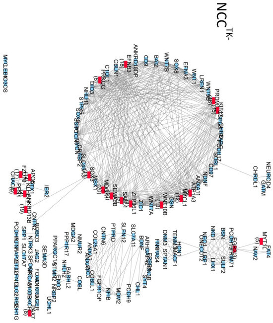 The 131-gene GAN of NCCs (Figure 3B and Figure 4B) formed six-node RCMs of medium complexity (7–12 edges) with high entropy (Savg = 0.9789) and RCMs of high complexity (13–15 edges) with low entropy (Savg = 0.7798). However, unlike the NPC GAN, the NCC GAN did not contain low-complexity (3–6 edges)/intermediate-entropy RCMs. There were fewer occurrences of the NCC medium-complexity/high-entropy RCMs and the high-complexity/low-entropy RCMs in NPCs, indicating that these NCC RCMs form largely during the NPC → NCC transition. Frequencies of the medium-complexity/high-entropy NCC RCMs were reduced markedly in NCCTK−s. Thus, in the NCC GAN, nFGFR1 promotes the formation of medium-complexity/high-entropy RCMs.