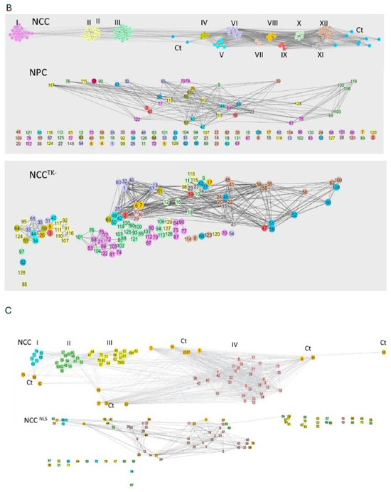 Clustered organization of coordinated GANs. (A) Clustered network formed by 83-gene NSD GAN in NPCs and its changes in NCCs and NPCTK−s. The NPC network formed nine clusters and eight non-clustered genes referred to as connectors (Cts) labeled with different colors. All genes and cluster assignments are listed in Table S3A. (B) Clustered network formed by the 131-gene NSD GAN in NCCs (Figure 3B) and networks of the same genes in NPCs and NCCTK−s. The NPC network formed 12 clusters and eight non-clustered connectors (Cts). Genes discussed in the text are listed in table inset. All genes are listed in Table S3B. (C) Clustered network formed by 90-gene GAN in NCCs (Figure 3C) and by the same genes in NCCNLSs (Figure 3C). The NCC network was composed of four clusters and 14 non-clustered connectors (Cts). All genes are listed in Table S3C.