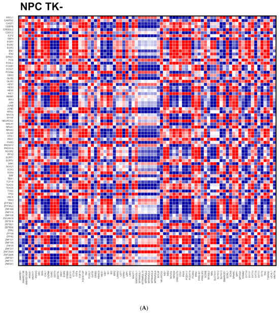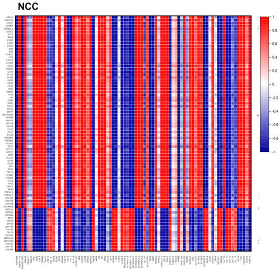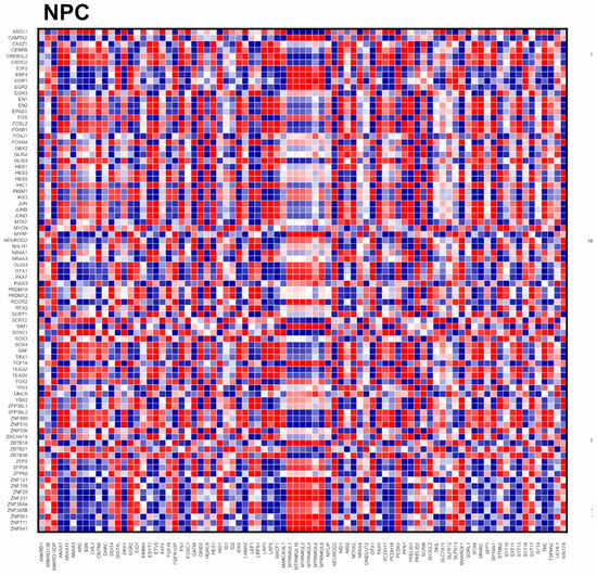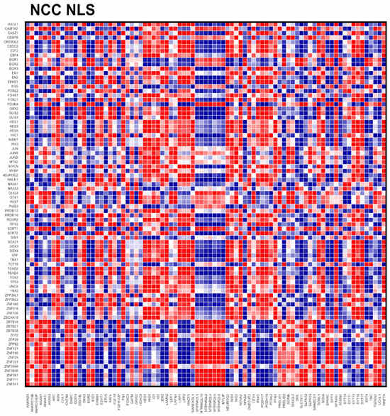Figure 6A shows a heat map of the strongly correlated transcription factor genes and neurodevelopmental genes in NCCs. Genes for transcription factors such as CREB and the families of EGR, Fos, Fox, GLIS, HES, Jun, Sox or TEADs, and ZNF display similar patterns of coordination (positive or negative) similar to those for with the neurodevelopmental genes; these are referred to as group I. The pattern of cross-correlations formed by transcription factors of the ZNF family, ZBTB, and ZFP (referred to as group II) were mostly opposite to that of group I. These distinct patterns were largely absent in NPCs, which suggests that transcription factors in groups I and II act in concert to program the neurodevelopmental genes during NPC → NCC transition. However, the functions of groups I and II appear to be opposite. The mirror-like patterns of the NCC gene cross-coordination were disrupted in NCCTK−s and in NCCNLSs (Figure 6A).