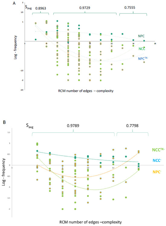The 83-gene NSD GAN of NCCs B and Figure 4B) formed six-node RCMs of low complexity (3–6 edges) with intermediate entropy (Savg = 0.893), RCMs of medium complexity (7–12 edges) with high entropy (Savg = 0.9729), and RCMs of high complexity (13–15 edges) with low entropy (Savg = 0.7555) (Figure 6A). The frequency of RCMs in NPCs declined between the low- and high-complexity RCMs (from the simple 5-edge RCM to the most complex 15-edge RCM). After the transition to NCCs, the medium-complexity/high-entropy RCMs became less frequent, and the formation of medium-complexity/high-entropy and high-complexity/low-entropy RCMs was reduced in NPCTK−s. Thus, in the NPC GAN, nFGFR1 promotes the formation of medium-complexity/high-entropy and high-complexity/low-entropy RCMs.