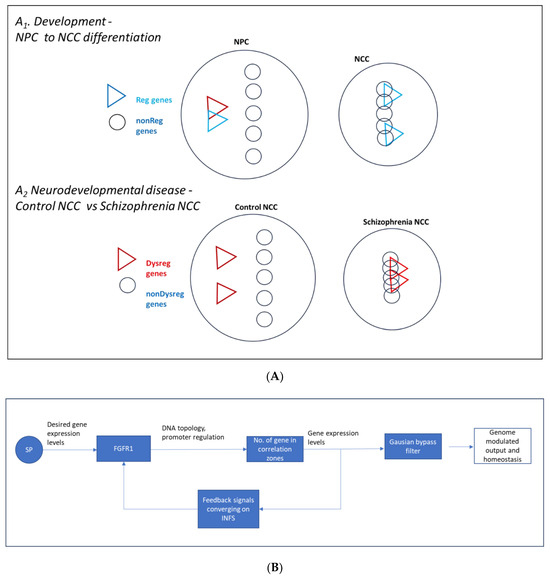 (A) Entropy-based genome synchronization model. (A1): in neural development (NPC → NCC transition), the global expressed genome becomes more synchronized, and the nonReg genes (whose average activity does not change) become more synchronized with each other (lower entropy). The Reg genes (whose average activity changes) become less synchronized to each other but more synchronized to the nonReg genes. The model implies that the nonReg genes increasingly shape the regulation and homeostasis of the Reg genes. This process is controlled by nFGFR1, which makes the NCC Reg genes synchronize less with themselves and more with the nonReg genes. (A2): in schizophrenia, neuronal development in the brain is impaired and nFGFR1 expression is dysregulated. The population of Dysreg genes (genes with different average activity in NCCs from patients with schizophrenia compared to that in NCCs from control individuals) and the global expressed genome become more synchronized. The nonDysreg genes (whose activity is not different in schizophrenia and control NCCs) also become more synchronized with each other and with the Dysreg genes. The model implies that the nonDysreg genes shape the activity changes of the Dysreg genes and thus brain maldevelopment in schizophrenia. (B) nFGFR1 as a proportional-integral-derivative controller and band-pass filter. nFGFR1 maintains gene programming at an ontogenic setpoint by (i) assessing the genome’s output through signals that converge on integrated nuclear FGFR1 signaling (INFS), (ii) determining the difference between the setpoint and the measured output, and (iii) adjusting coordinate gene activities (GANs) through the DNA topology and discriminating fold changes (band-pass filter) such that genome programming closely matches the setpoint.