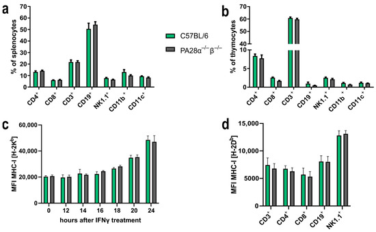 To determine if PA28αβ could influence the composition of immune cells in the spleen and thymus, PA28αβ-deficient mice and C57BL/6 control mice were stained for CD4, CD8, CD3, CD19, NK1.1, CD11b and CD11c and analyzed by flow cytometry. The assessment of these immune-cell population did not reveal any impact attributable to the absence of PA28αβ (Figure 1a,b). Given the important role of the proteasome in the MHC class I presentation of immunogenic peptides, we investigated the potential impact of PA28αβ on the MHC class I surface expression. Murine embryonic fibroblasts (MEFs) derived from either wild-type mice or PA28αβ-deficient mice were treated with IFN-γ. The H-2Kb surface expression was analyzed by flow cytometry. IFN-γ induced an upregulation of H-2Kb in a time-dependent manner. However, the MHC class I surface expression remained unchanged in the absence of PA28αβ (Figure 1c). Comparative analyses of the most prevalent immune-cell subsets in the spleen between wild-type and PA28αβ-knockout mice revealed no significant differences in the MHC class I surface expression on T cells (CD3+), cytotoxic T cells (CD8+), T helper cells (CD4+), B cells (CD19+) or natural killer cells (NK1.1+) (Figure 1d). Our findings suggest that the potential contribution of PA28αβ to the processing of immunogenic peptides is rather negligible.