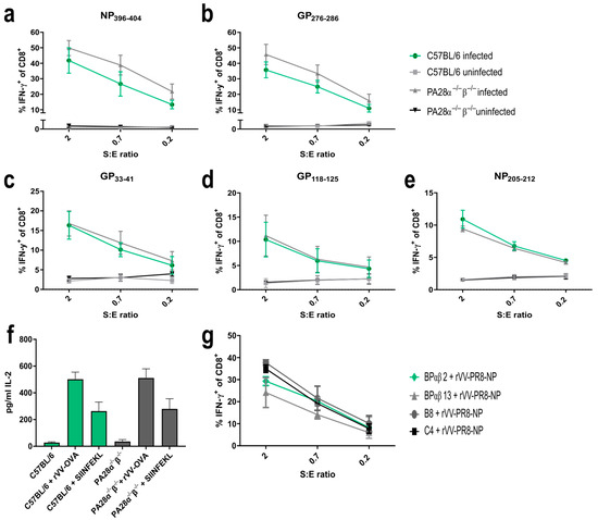 For the LCMV antigen-presentation assays, C57BL/6 and PA28α−/−β−/− MEFs were stimulated with 100 U/mL IFN-γ for 48 h. Afterwards, cells were infected with LCMV-WE (MOI 0.5) for 24 h at 37 °C. Viable peptide-specific CTLs were incubated with MEFs for 5 h with the addition of 10 μg/mL Brefeldin A (Thermo Fisher Scientific, Darmstadt, Germany). Antigen presentation was analyzed via intracellular staining for the IFN-γ+ of CD8+ CTLs. For the SIINFEKL presentation, C57BL/6 and PA28α−/−β−/− MEFs were stimulated with 100 U/mL IFN-γ for 48 h followed by three hours of infection with rVV-Ova (MOI 10). Next, 5 × 105 MEFs were co-cultured with 106 B3Z hybridomas for 24 h at 37 °C. The activation of hybridomas was analyzed via an IL-2 ELISA according to the manufacturer’s protocol (mouse IL-2 ELISA Ready-SET-Go!®, eBiosciences,, Frankfurt a. Main, Germany). For influenza A peptide generation (NP147-155), C4, B8, BPαβ13 and BPαβm2 were infected with rVV-PR8-NP147-155 (MOI 10) for 4.5 h. Subsequently, the infected cells were co-cultured with peptide-specific CTLs for three hours. Antigen presentation was analyzed via the intracellular staining of IFN-γ+ CD8+ CTLs as previously described [25].