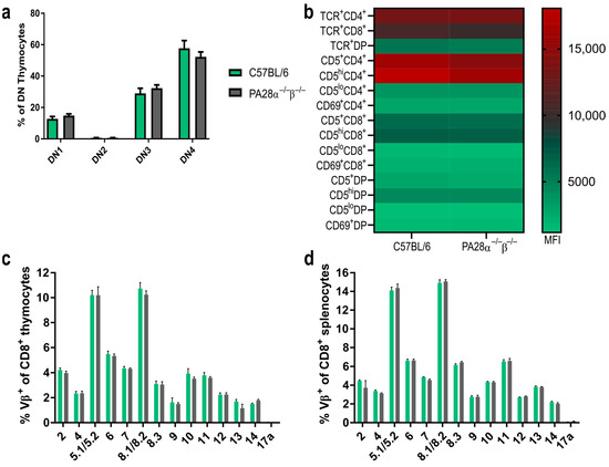 As PA28αβ is expressed in the thymus [26] and because the proteasome plays an important role in the selection of CD8+ T cells, we investigated whether PA28αβ influenced the development of T cells in the thymus. We checked the CD44+/CD25+ expression, which is used to differentiate between CD4−/CD8− double-negative (DN) 1, DN2, DN3 and DN4 thymocyte populations. No discernible differences were observed in the DN development between wild-type and PA28αβ-knockout mice (Figure 4a). Additionally, the CD5 expression, serving as a marker for the intensity of T cell receptor (TCR) interactions with self-MHC peptides, and the CD69 expression, indicating the successful positive selection of T cells, were evaluated across CD4+ single positive (SP), CD8+ SP, and double-positive (DP) thymocytes in both wild-type and PA28αβ-deficient mice. The expression levels of CD5 and CD69 on all examined subsets did not vary, which indicated an unimpeded T cell development in PA28αβ-deficient mice (Figure 4b). Furthermore, the TCR composition was examined using a flow cytometry TCR Vβ screening panel for both CD8+ splenocytes and CD8+ thymocytes from wild-type and PA28αβ-deficient mice (Figure 4c,d and Figure S2 for CD4+ splenocytes and CD4+ thymocytes). The TCR Vβ analysis revealed no differences in either the bulk T cell selection in the thymus or in the periphery in the spleen of PA28αβ-deficient mice. In addition, the H-2Db and H-2Kb surface expression on mTECs and cTECs was analyzed in the thymus of wild-type mice and PA28αβ-deficient mice (Supplementary Figure S3). Neither the total amount of mTECs or cTECs nor their MHC-I surface expression were different in PA28αβ-deficient mice.