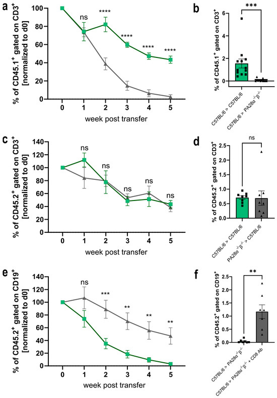 CD3+ cells were purified using a CD3ε MicroBead Kit (Miltenyi Biotec GmbH, Bergisch Gladbach, Germany) and CD19+ using a Pan B Cell Isolation Kit II (Miltenyi Biotec GmbH, Bergisch Gladbach, Germany) according to the manufacturer’s protocols. Next, 1 × 107 cells in 100 µL PBS were injected i.v. Blood was taken once a week for five weeks and analyzed for CD3+ or CD19+ cells, respectively. CD8 depletion was performed by an i.p. injection of a CD8α-depleting antibody (250 µg, purified from clone YTS 169.4.2) once a week, starting one day prior to the adoptive cell transfer. The depletion efficiency was checked via flow cytometry. The cell transfer of cells from male mice into female mice was used as a control for rejection and is depicted in Supplementary Figure S4a.