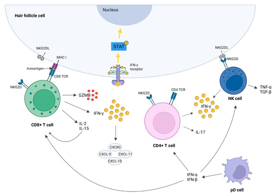 Immune cells responsible for AA development. Cytotoxic CD8+ T cells (CD8+NKG2D+ T cells) are the first immune cells that infiltrate the HF surrounding and are considered to be the main drivers of disease pathogenesis. CD8+NKG2D+ T cells produce IL-2, IL-15, GZMB, and IFN-γ. IL-2 and IL-15 maintain CD8+NKG2D+ T cells via a positive feedback loop. GZMB promotes cell lysis, while IFN-γ triggers collapse of HF-IP by inducing JAK/STAT signaling. NK cells also express the NKG2D and may attack the HF cells upon binding the NKG2D ligand in similar manner as the CD8+ cells. Effector CD4+ and NK cells both produce IFN-γ, which then further induces the production of chemokines (CXCR3, CXCL-9, CXCL-10, and CXCL-11) and maintains inflammation by attracting other immune cells into the peribulbar space. Plasmacytoid dendritic cells (pDCs) produce large quantities of type I interferons (IFN-α and β), which induce CD4+, CD8+, and NK responses toward the HFs in AA patients. Adapted from [9,13].
