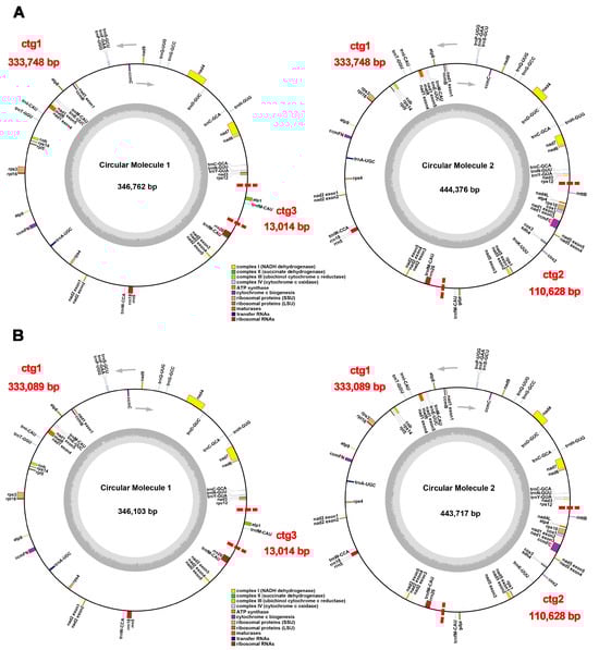 Structure and characteristics of the complete mitochondrial genomes of P. montana var. thomsonii (A) and P. montana var. montana (B). The arrows indicate that genes inside the circle are transcribed in the clockwise direction, and genes outside the circle are transcribed in the counter-clockwise direction. Different colors indicate genes belonging to different functional groups. Dark gray in the inner circle indicates the GC content, and light gray indicates AT.