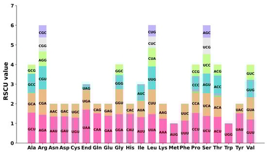 The codon usage bias of the 33 unique PCGs in the mt genomes of the two P. montana varieties was analyzed, respectively, and the utilization of each amino acid for codons is detailed in Table S1. The codon preference was comparable across the two cultivars, with just P. montana var. thomsonii being used as an example (Figure 2). Serine (Ser), Arginine (Arg), and Leucine (Leu) were the most often used amino acids, whilst methionine (Met) and tryptophan (Trp) were the least utilized amino acids among the 33 PCGs. Codons with a Relative Synonymous Codon Usage (RSCU) over one are thought to be favored by amino acids. Apart from the initiation codon (AUG) and the tryptophan codon (UGG), both of which had an RSCU value of one, the mitochondrial PCGs exhibited a strong tendency for certain codons. For instance, the termination codon for UAA showed the greatest preference among the mitochondrial PCGs, with an RSCU value of 1.7 (Figure 2). Additionally, alanine (Ala) preferred the codon GCU, with an RSCU value of 1.55. These data results reveal a substantial tendency toward a high proportion of NNA and NNU, comparable to other terrestrial plant species [18].