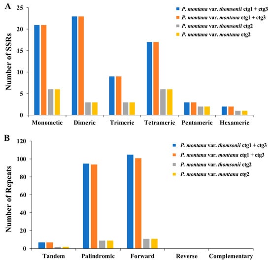 Number of repeat elements in mt genomes of P. montana var. thomsonii and P. montana var. montana. (A) Number of SSRs, SSR, simple sequence repeat. (B) Number of repeated sequences.