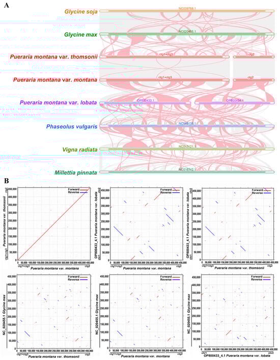 Collinearity analysis (A) and dot plot (B) of the mitochondrial genome of P. montana species with close relatives. (A) the red arc area implies inversion, whereas the gray area represents areas with high homology. (B) Red lines in the boxes represent forward comparisons, and blue lines represent reverse complementary comparisons.