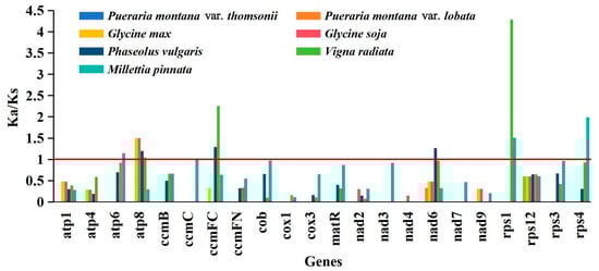 Calculating non-synonymous substitutions (Ka) and synonymous substitutions (Ks) is crucial for reconstructing phylogeny and understanding the evolutionary processes of protein-coding regions in closely related species [21]. The Ka/Ks ratio in genetics is used to assess the presence of selection pressure on a particular protein-coding gene during evolution. When Ka/Ks is more than one, it indicates positive selection. When Ka/Ks equals one, it indicates neutral selection. When Ka/Ks is less than one, it indicates negative selection [22]. The 27 PCGs from the P. montana var. montana mt genome were compared with those of 7 samples from 6 species, P. montana var. thomsonii (PP275071 and PP275072), P. montana var. lobata (OP800433.1 and OP800434.1), Glycine max (NC_020455.1), G. soja (NC_039768.1), Phaseolus vulgaris (NC_045135.1), Vigna radiata (NC_015121.1), and Millettia pinnata (NC_016742.1) for the Ka/Ks calculation, excluding results for 5 PCGs that exhibited Ka/Ks values of zero across all compared species (Figure 6). Overall, no Ka/Ks values higher than one were observed in P. montana var. montana compared to P. montana var. thomsonii and P. montana var. lobata, suggesting that mt genes are highly conserved among three varieties of P. montana. The Ka/Ks values of P. montana var. montana atp8 compared to G. max and G. soja suggest that positive selection occurred during evolution between Pueraria and Glycine. Most genes (21) experienced negative selection throughout their evolution, as shown by the Ka/Ks values, which made up 77.78% of the 27 protein-coding genes, being less than one when compared to other plant species. These findings indicate that mitochondrial genes are well-preserved over the evolutionary process in Fabaceae plants.
