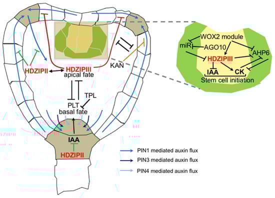 Family III HD-ZIPs are pivotal to the regulation of embryo polarity and determine the apical fate by antagonizing the function of auxin-regulated, root-pole-specific PLT/AIL TFs [39] (Figure 1). The expression of HD-ZIP III genes is restricted to the upper cell tier of the embryo following non-cell-autonomous regulation by microRNA 165 and 166 (miR165/6) [40,41,42,43,44]. The disruption of the HD-ZIP III expression domain alters embryo polarity: the misexpression of miR-resistant HD-ZIP III transcripts transform the root pole into a secondary shoot [39]. In contrast, the PLT/AIL members PLT1, PLT2, PLT3/AIL6, and PLT4/BBM are expressed in an IAA-dependent manner in the lower cell tier of the embryo and determine the root pole fate [30,31,45].