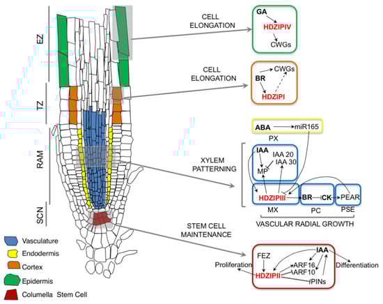 One of the fundamental questions in developmental biology is how different shapes of multicellular organisms are determined by the genetic properties of an individual. It is widely accepted that patterns of signaling molecules—often referred to as morphogens—are established in clusters of cells at a specific developmental stage and determine the identity of those cells and eventually their fate. Morphogen patterns do not only determine whether the cells are bound to proliferate or differentiate, but they also provide the spatial and temporal parameters that regulate the dynamics of tissue growth [1,2]. In plants, where cell migration is impeded by the presence of the cell wall and programmed cell death is restricted to a few tissues, the regulation of growth dynamics underlying shape emergence depends on the localized patterns of morphogen-like molecules like transcription factors and phytohormones [3,4]. Indeed, molecular regulatory networks encompassing transcriptional cascades and hormonal signaling play key roles in determining the basal body shape during embryogenesis as well as the whole architecture of adult plants. Hormone/TF networks also represent a hallmark of plant evolution as the recruitment of pre-existing signaling molecules, the generation of new ones via genome duplication and neofunctionalization, and their assembly into novel developmental genetic toolkits in a sort of “genetic bricolage” allow for the generation and further diversification of new plant architectures required for land colonization [5,6,7]. Key morpho-physiological innovations that characterize land plants, such as the presence of a root for soil anchorage, the development of a branched structure with expanded appendices for improved photosynthesis, the presence of a cuticle, and a vasculature for better resistance to desiccation, have been accompanied by the expansion and diversification of hormone signaling machinery and of families of transcriptional regulators [6,8]. HD-ZIP transcription factors play a pivotal role in the adaptation of plants on lands [9], and there is evidence that HD-ZIPs have been recruited multiple times during evolution to alter organ shapes and generate new specialized structures [10,11,12]. An increasing body of works demonstrates that HD-ZIP TFs exert their developmental role by controlling the accumulation, distribution, and signaling of multiple hormones. Here, we will review our current knowledge on HD-ZIP/hormone networks in the regulation of plant architecture and tissue growth across different developmental stages of the model plant Arabidopsis thaliana.