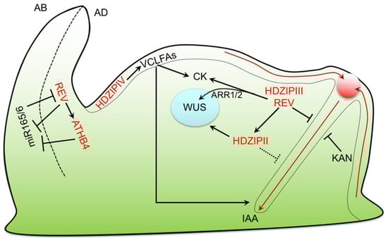 Schematic representation of HD-ZIP/hormone networks in SAM. REV and KAN restrict PIN1-mediated transport (red arrows) to narrow region of cells that will accumulate auxin (red dot) and give rise to primordium. REV and other HD-ZIP III TFs also interfere with CK synthesis and transport, affecting WUS expression and SAM identity. HD-ZIP II members are regulated by REV and may contribute to regulation of auxin transport via PIN1 and are required for WUS expression. Members of HD-ZIP II and III families also regulate primordium dorso-ventral polarity by repressing miR165/6. HD-ZIP IV regulates VCLFA biosynthesis in L1 layer. VCLFAs, by concurrently acting on CK and PIN1-mediated transport, might regulate proliferation in inner tissues.