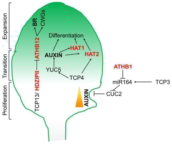 HD-ZIP/TCP networks control the leaf size and shape. The HD-ZIP II factors HAT1 and HAT2 act downstream of TCP4 and IAA to promote leaf cell differentiation. HAT2 is also a direct target of TCP4. TCP13, and paralogs TCP5 and TCP17, interact with HD-ZIP II TFs to control leaf expansion. TCP13, likely together with ATHB2, negatively controls the leaf size by repressing ATHB12 which, in turn, promotes cell expansion by acting on BR biosynthesis and cell wall genes (CWGs). ATHB1 promotes leaf serration by controlling CUC2 expression via miR164. CUC2 regulates leaf serration by modulating auxin accumulation at the leaf margin. miR164 expression is positively regulated by TCP3.
