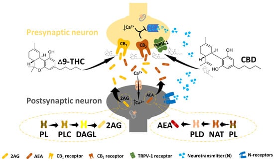 - Bisogno, T.; Hanuš, L.; De Petrocellis, L.; Tchilibon, S.; Ponde, D.E.; Brandi, I.; Moriello, A.S.; Davis, J.B.; Mechoulam, R.; Di Marzo, V. Molecular targets for cannabidiol and its synthetic analogues: Effect on vanilloid VR1 receptors and on the cellular uptake and enzymatic hydrolysis of anandamide. Br. J. Pharmacol. 2001, 134, 845–852. [Google Scholar] [CrossRef] [PubMed]