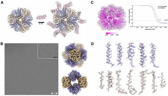 - Liu, Y.; Huynh, D.T.; Yeates, T.O. A 3.8 Å Resolution Cryo-EM Structure of a Small Protein Bound to an Imaging Scaffold. Nat. Commun. 2019, 10, 1864. [Google Scholar] [CrossRef] [PubMed]