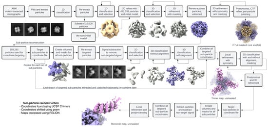 Data processing overview. The CryoEM processing pipeline used in this study is outlined using the sub-particle averaging approach to reach the final trimeric and monomeric maps. The software required for the protocol used here of sub-particle reconstruction is outlined.