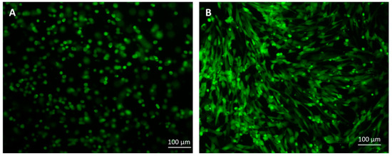 The cells stained with CFDA-SE fluorescent dye: (A) cells suspended in HA, (B) cells cultured for 7 days. Scale bar = 100 µM.