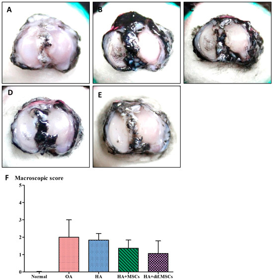 The osteoarthritis scores of each group were examined by (A–E) India ink staining and (F) macroscopic score.