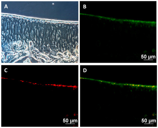 Five proximal tibia samples were fixed in 10% buffered formaldehyde at 4 °C for 72 h. To decalcify the tissues, they were soaked in 5% nitric acid for 7 days and, then, embedded in optimal cutting temperature (OCT) compound. Tissue slices with a thickness of 15 mm were sectioned [39]. The tissue slides were stained using hematoxylin and eosin (H&E) and safranin O before being examined and scored following the Mankin et al. [40] and Armstrong et al. [41] methods. In the case of immunohistochemistry, the tissue slides were incubated using primary polyclonal antibodies (rabbits against type II collagen) with a 1:200 dilution (COSMO BIO, Tokyo, Japan) for an hour at room temperature. After washing with PBS, the tissue slides were incubated in HRP anti-mouse IgG secondary antibody for 30 min at room temperature. The tissue slides were visualized using VECTA STAIN ABC Reagent (Vectastain Elite Kit; Vector Laboratories). To conduct fluoroscopic analysis, CFDA-SE labeled cells were studied in a tibial frontal section using a fluorescence microscope with 492 nm and 517 nm settings [16].
