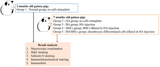In group 4 and 5, each guinea pigs received a 100 µL injection containing a total of 1 × 106 cells (MSCs in group 4, and chondrocytes derived from MSCs in group 5) that were labeled with CFDA-SE and suspended in HA (Hyruan®III; LG Chem, Seoul, Republic of Korea). The injection was administered into the medial compartment of the knees of the guinea pigs [16].