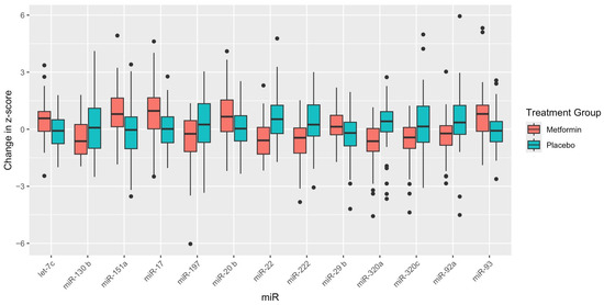 MiR-17-5p is involved in cell proliferation, inflammation, mitochondrial function, and diabetes-related vascular damage [32]. Altered expression of miR-17-5p has previously been associated with T2D and gestational diabetes, obesity, and non-alcoholic fatty liver disease (NAFLD) [32,33], but it has not yet been reported in relation to metformin therapy for these diseases. miR-17-5p was upregulated in our metformin sample compared with placebo.