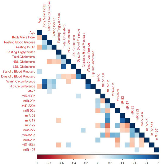 Correlation plot featuring only miRNAs significant after adjustment for multiple comparisons and baseline clinical characteristics. Cells with p > 0.05 are omitted. Color coding represents the Spearman rank correlation coefficient with red indicating an inverse association and blue indicating a positive association.