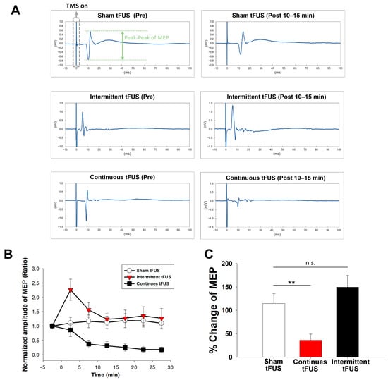 Representative motor-evoked potential (MEP) responses of a rat before and after receiving either sham, intermittent, or continuous transcranial focused ultrasound stimulation (tFUS) are displayed for each measurement period (A). The average normalized MEP amplitudes across the three intervention protocols (sham, intermittent, or continuous tFUS) are shown (B). The mean cortical excitability responses were calculated for each intervention group within 30 min following the different stimulations (C). Data are presented as mean ± SEM for 7–8 rats per group. ** indicates p < 0.01, denoting significant differences in MEP size post-intervention compared with the baseline measured before tFUS, as determined by a post-hoc Fisher’s LSD test. n.s.: no significance.