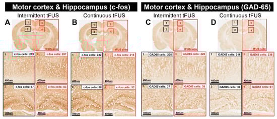 Representative immunohistochemically stained sections highlighting the regions of interest (ROI) comprising the motor cortex and hippocampus. The data illustrate the quantity of c-Fos-positive cells within the ROI following intermittent transcranial focused ultrasound stimulation (tFUS) (A) and continuous tFUS (B). Similarly, the number of GAD-65-positive cells in the motor cortex and hippocampus is shown after exposure to intermittent tFUS (C) and continuous tFUS (D).