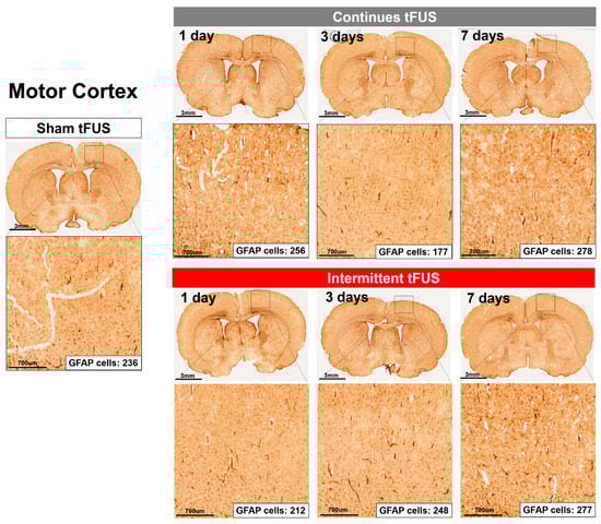 Representative images of glial fibrillary acidic protein (GFAP) immunostaining in the motor cortex of rats sacrificed 1 day, 3 days, and 7 days after receiving sham, continuous, or intermittent tFUS are presented. Compared to rats that received sham stimulation, no obvious astrogliosis was observed at or near the sonicated sites in the brains of those treated with either continuous or intermittent tFUS.