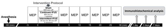 Schematic diagram of the experimental design for testing changes in cortical excitability after tFUS or sham stimulation in anesthetized rats. In this representative experiment, anesthetized rats received intervention protocols for 600 sec. Motor-evoked potentials (MEPs) were measured at baseline and 0, 10, 20, and 30 min after tFUS intervention. Subsequently, the rat brains were removed and subjected to immunohistochemistry for further investigation.