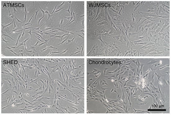 Primary adherent cultures of human ATMSCs, WJMSCs, SHEDs, and chondrocytes. Phase-contrast microscopy.