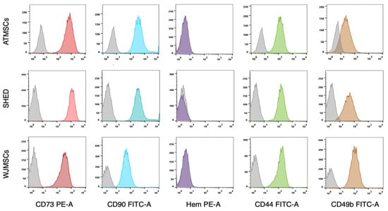 Expression of surface molecular markers by MSCs isolated from different tissues. Cell suspensions of ATMSCs, SHED, and WJMSCs were treated with fluorochrome-conjugated monoclonal antibodies and analyzed by flow cytometry. Grey curves—isotype-negative controls. Colored curves correspond to specific molecular markers. Hem—cocktail of antibodies for hematopoietic markers (CD45, CD34, CD14, CD11b, CD79a, CD19, and HLA-DR).
