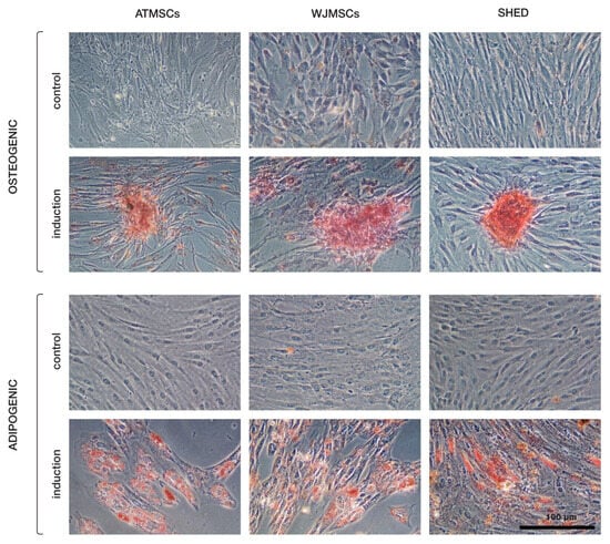 Multilineage differentiation of ATMSCs, WJMSCs, and SHEDs. Osteogenic differentiation (upper rows) was assessed using alizarin red S staining, and adipogenic differentiation (bottom rows) using oil red O.