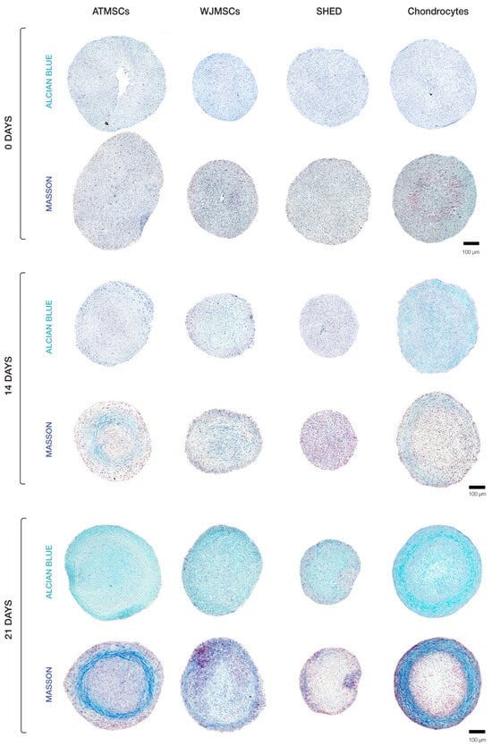 For all spheroid types, the collagen production in ECM was higher on day 21. Masson staining for collagen showed the strongest positive reaction in ATMSC-derived spheroids. Collagen fibers were notably visible at the periphery of chondrocyte and ATMSC spheroids, as well as in the central region of WJMSC spheroids. In SHED spheroids, the collagen staining was of low intensity.
